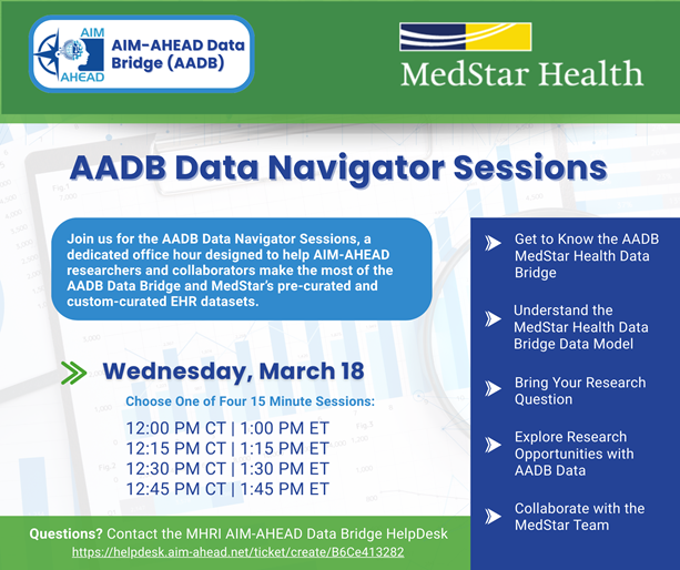 This dedicated office hour is designed to help AIM-AHEAD researchers and collaborators make the most of the AADB Data Bridge and MedStar’s pre-curated and custom-curated EHR datasets.