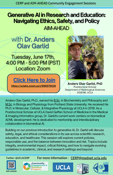Session Details: Building on our previous introduction to generative AI, Dr. Garlid will discuss safety, legal, and ethical considerations in its use across scientific research, education, and healthcare. This session will explore current policies, responsible use, and the balance between innovation and risk. Topics include integrity, environmental impact, critical thinking, and how to navigate evolving guidelines in academic, clinical, and research settings and beyond.