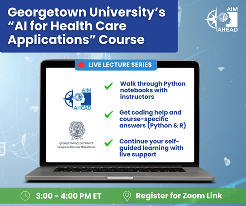 Join us for a virtual, live lecture series for Georgetown University’s “AI for Health Care Applications” course! We will meet on Zoom on Mondays starting March 2nd, from 2 p.m. to 3:00 p.m. Central Time.