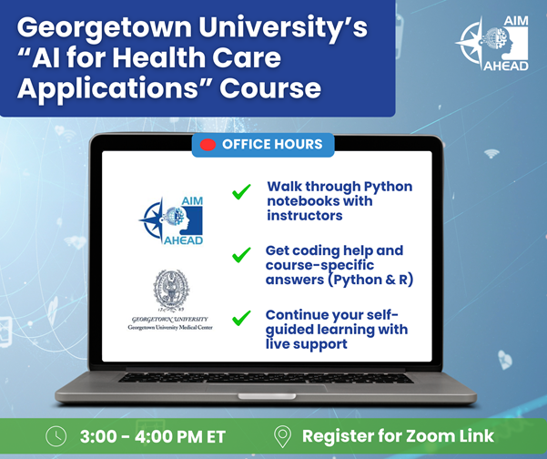 Join us for a virtual, live lecture series office hours for Georgetown University’s “AI for Health Care Applications” course! We will meet on Zoom on Mondays starting March 2nd, from 2 p.m. to 3:00 p.m. Central Time.