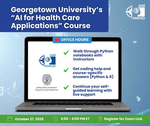 Join us for virtual office hours for Georgetown University’s “AI for Health Care Applications” course! Bring any specific questions about the self-guided course, or inquire about GU's other Python and R course offerings.