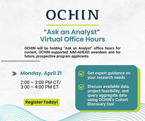 OCHIN will be holding “Ask an Analyst” office hours for current, OCHIN-supported AIM-AHEAD awardees and for future, prospective program applicants. Analysts will be available to discuss available data and project feasibility and to query aggregate data via OCHIN’s Cohort Discovery tool.