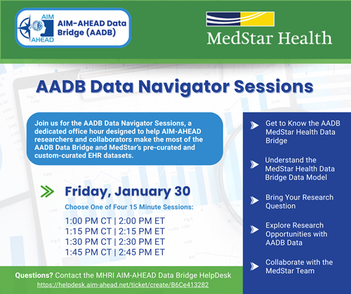 This dedicated office hour is designed to help AIM-AHEAD researchers and collaborators make the most of the AADB Data Bridge and MedStar’s pre-curated and custom-curated EHR datasets.